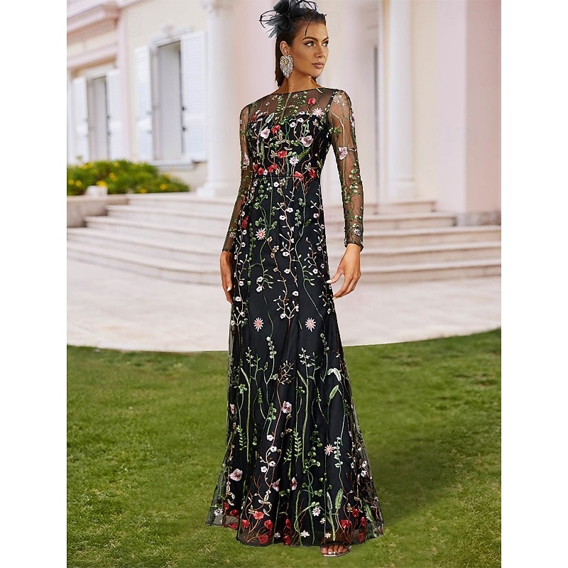 Beach Wedding Sheath Wedding Guest Dresses Floral Dress Semi Formal Garden Party Floor Length Long Sleeve Jewel Neck Fall Wedding Guest Tulle with Embroidery 1