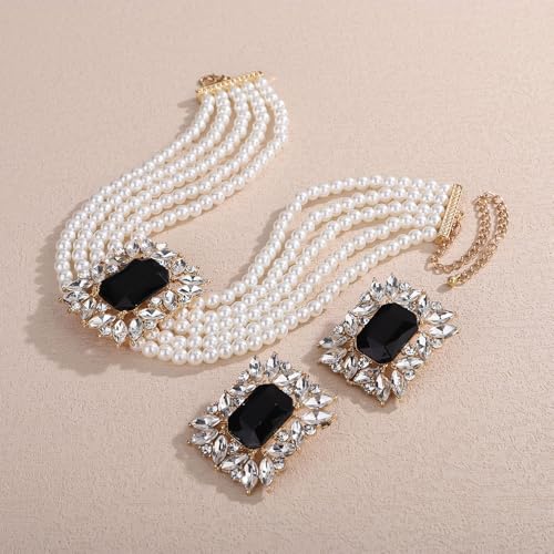Missgrace Vintage Boho 1920s Faux Pearl Necklace Earring Set Bride Faux Pearl Rhinestone Necklace Earring for Prom Bar Party Wedding 1
