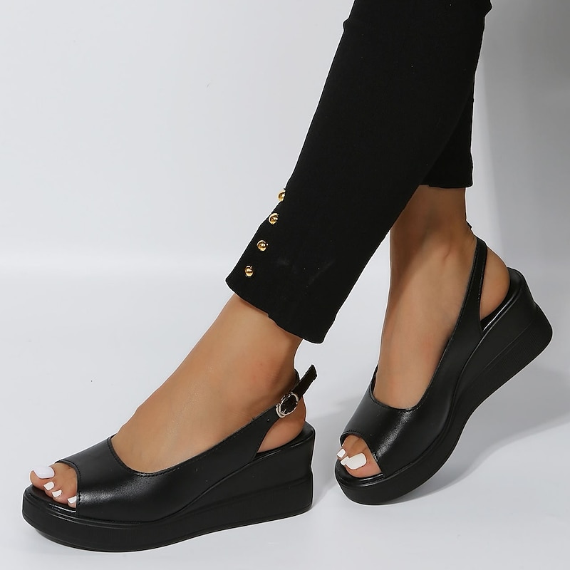 Highlights [Fabric Features] : These women’s sandals boast a sophisticated design with an upper made from high-quality PU material, giving a suede-like texture that exudes elegance. The durable EVA outsole ensures excellent grip and longevity, ideal for everyday wear. [Silhouette] : Designed with a comfortable wedge heel, these sandals provide the perfect balance of height and stability, making them an ideal choice for those who desire both style and comfort. [Design Highlights] : Featuring an open-toe and slingback design, these sandals include an elegant ankle strap for a secure fit. The minimalist solid black color adds a timeless and versatile touch, suitable for any occasion. [Occasions] : Perfect for summer days or outdoor gatherings, these sandals are suitable for both casual and semi-formal events. Whether you're taking a leisurely stroll or attending a weekend get-together, they offer a sleek, modern look that pairs beautifully with jeans or a sundress. [Size Range] : Available in a wide range of sizes from US5.5 to US8.5, accommodating various foot sizes for a comfortable and personalized fit.