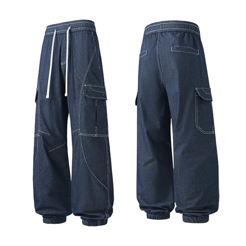 More information about XYXIONGMAO Men's Blue Washed Multi-Pocket Loose Cargo Pants Functional Hip Hop Techwear Casual Jeans Streetwear Slacks