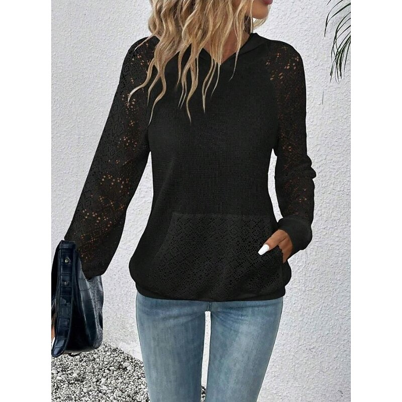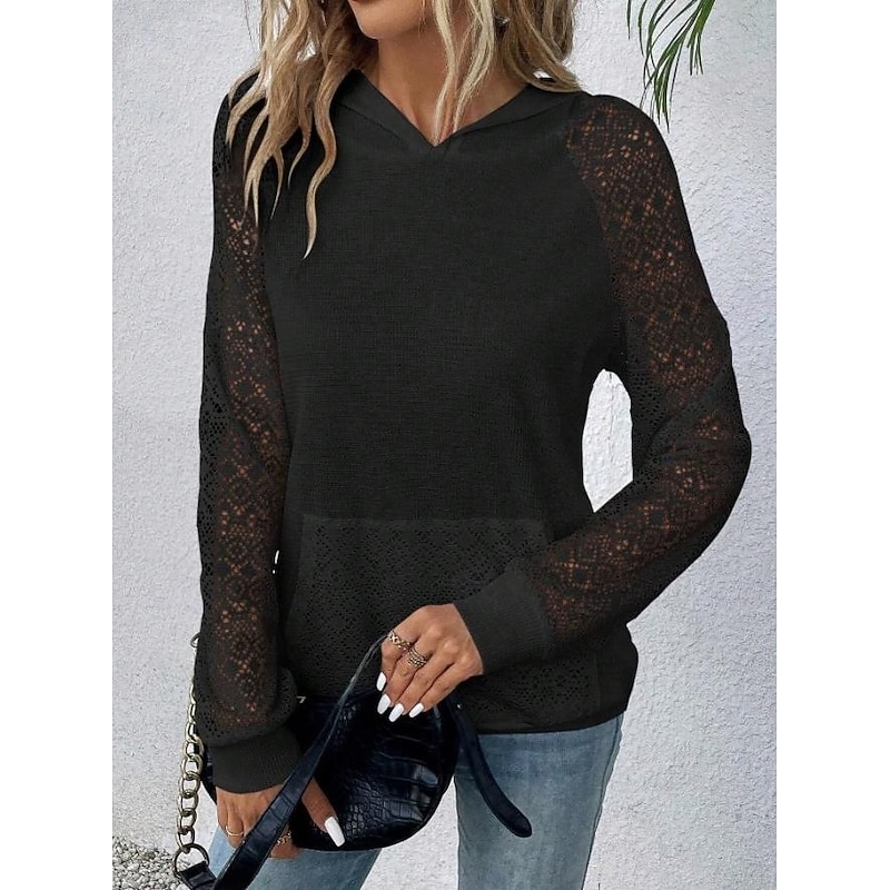 Highlights [Fabric] : Crafted from high-quality polyester, this women's hoodie provides a soft and comfortable feel with micro-elasticity, ensuring both warmth and ease of movement. [Fit] : Designed in a relaxed, regular fit, this hoodie offers all-day comfort and versatility, making it suitable for a variety of activities and settings. [Design Highlights] : Featuring intricate lace detailing on the long sleeves and hood, this stylish pullover adds a touch of femininity and sophistication. The kangaroo pocket enhances functionality while contributing to the casual yet elegant look. [Occasions] : Perfect for daily wear and sports activities during spring, fall, and winter. Whether you're out for a casual stroll or engaging in light exercise, this hoodie is an ideal choice for adding style to your daily routine. [Size Notice] : Available in a range of sizes from S to 2XL, select your usual size for the best fit.