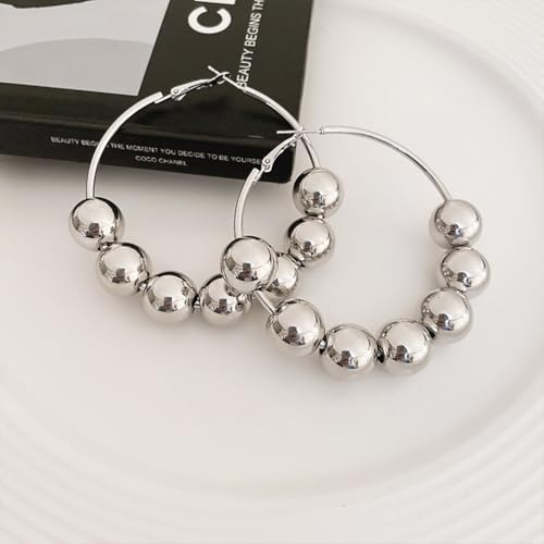 Trendy Gold Big Beaded Hoop Earrings Dainty Double Loop Silver Ball Bead Dangle Earring for Women Large Vintage Round Circle Dangling Statement Jewelry 6