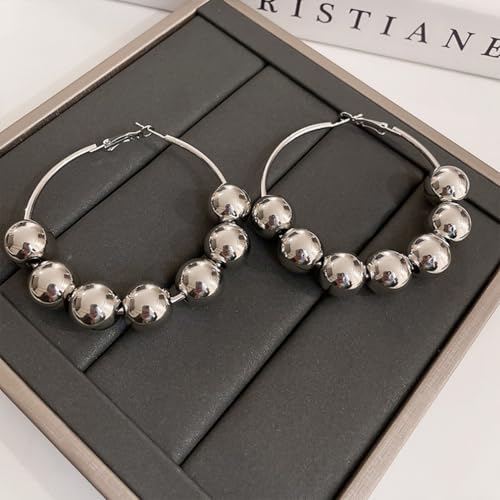 Trendy Gold Big Beaded Hoop Earrings Dainty Double Loop Silver Ball Bead Dangle Earring for Women Large Vintage Round Circle Dangling Statement Jewelry 7