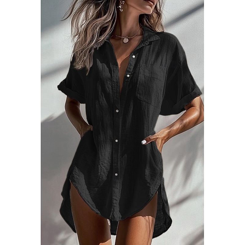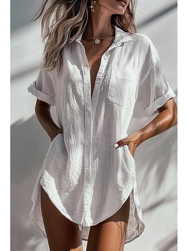 More information about Women's Shirt Linen-Inspired Shirts Button Up Blouse Plain Basic Modern Short Sleeve Shirt Collar Long Tops Holiday Going out Buttons Pocket Asymmetric Black White Apricot Summer