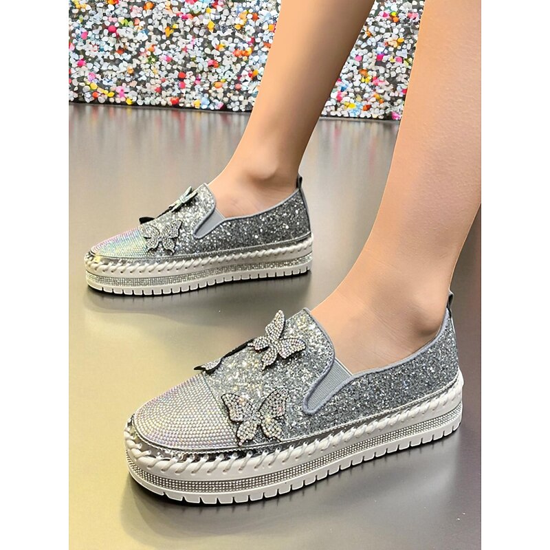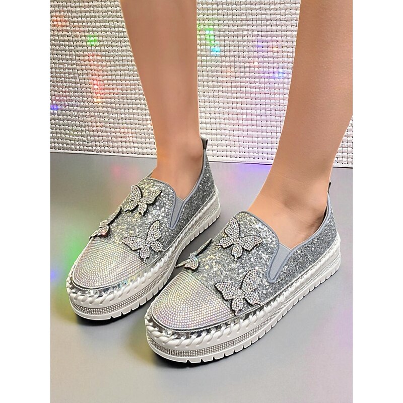 HOT ! Women's Purple Glitter Slip-On Platform Sneakers with Rhinestone Butterfly Design - Trendy Nightlife Party and Clubwear Shoes
