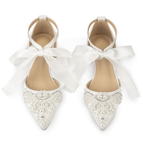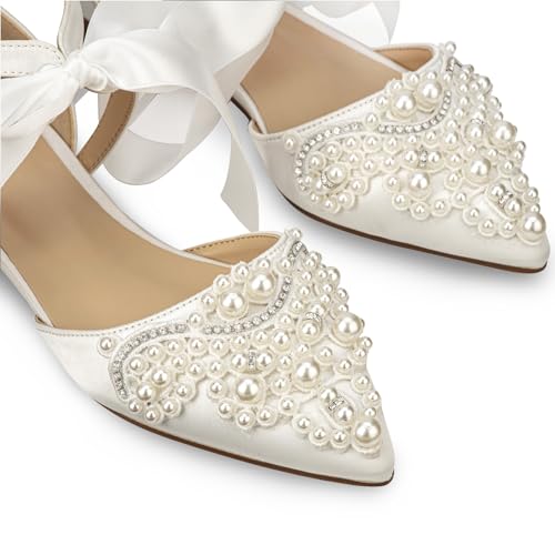 More information about Women's Wedding Flat Pearl Rhinestone Pointed Toe Ivory Satin Ribbon Tie Bridal Shoes