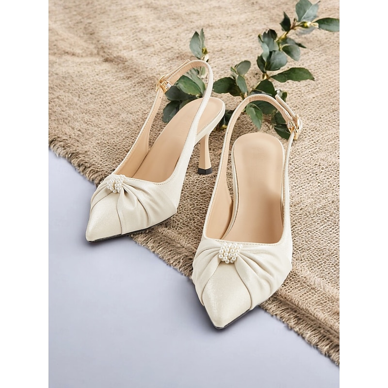 More information about Women's Ivory Pointed Toe Slingback Kitten Heels with Pearl Embellishment – Elegant Satin Wedding Shoes for Romantic Dates and Garden Parties