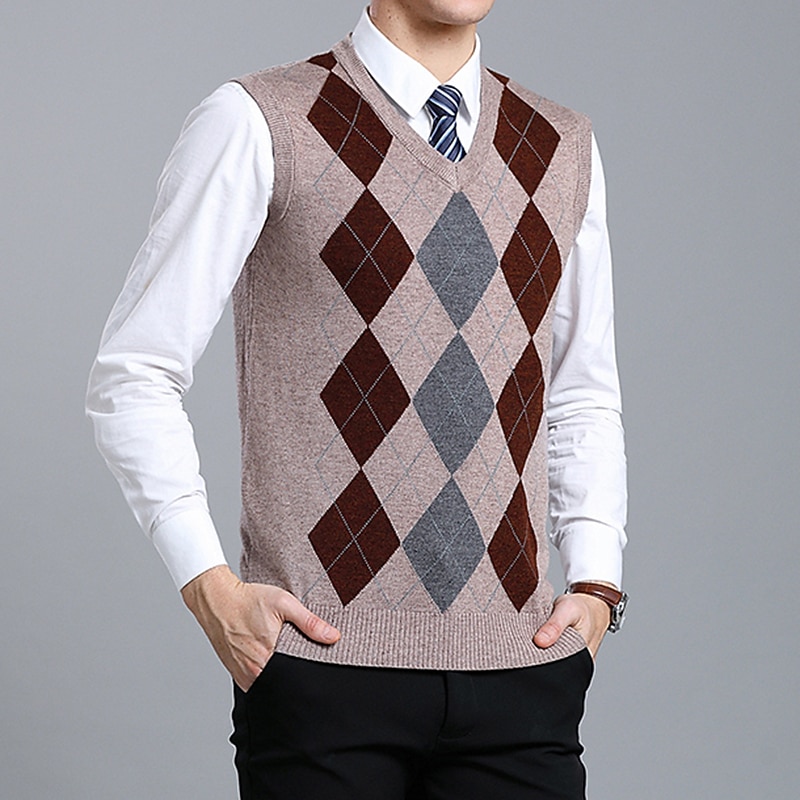 More information about Men's Sweater Vest Dress Sweater sleek Vintage Style Color Block Argyle Ribbed V Neck Patchwork Knitted Braided Drop Shoulder Sleeveless Knit Christmas Home Work Red Navy Blue Spring Fall