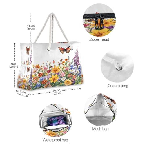 More information about Spring Wildflowers and Butterflies Beach Bag with Top Zipper Closure, Waterproof Pool Bag, Large Beach Tote for Women#800