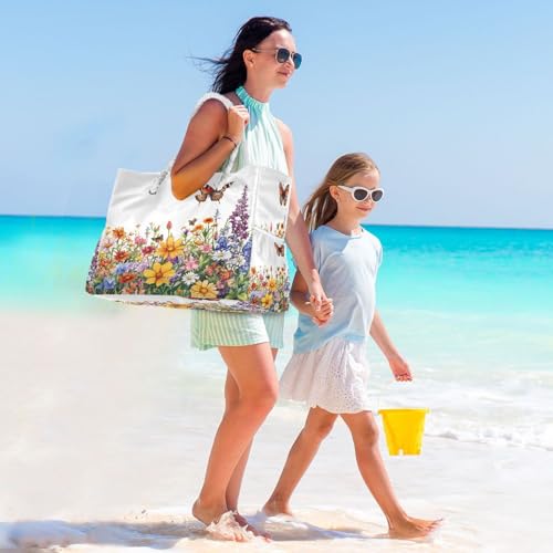 HOT ! Spring Wildflowers and Butterflies Beach Bag with Top Zipper Closure, Waterproof Pool Bag, Large Beach Tote for Women#800