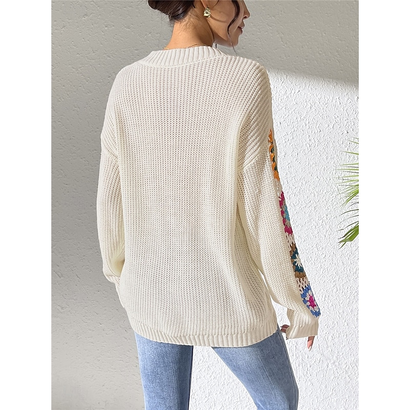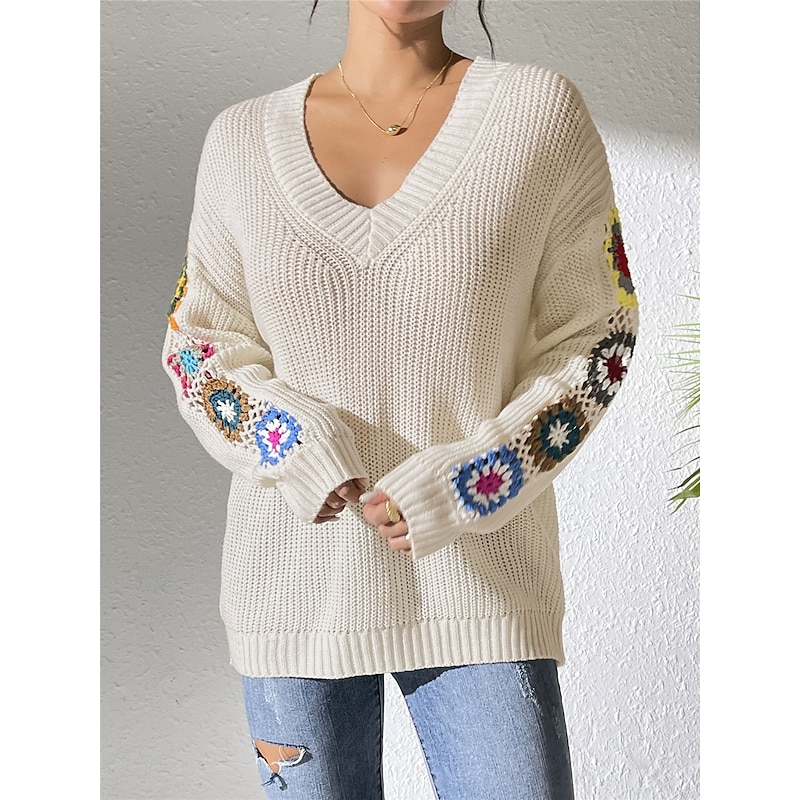 Highlights [Product Title] : Women's V Neck Crochet Knit Sweater - Floral Design for Fall & Winter [Fabric] : Crafted from high-quality polyester with a micro-elastic knit, this sweater offers warmth and a soft touch, making it ideal for the cooler months of fall and winter. [Fit] : Designed with a regular fit, this sweater features a V-neckline that adds an element of elegance to its relaxed, cozy silhouette, ensuring comfort for everyday wear. [Design Highlights] : The sweater showcases long sleeves adorned with intricate crochet floral patterns, bringing a bohemian flair. Ribbed cuffs and hem provide a snug and polished fit, while the knit style enhances its textured appeal. [Occasions] : Perfect for daily wear, outdoor activities, and weekend outings, this casual yet chic sweater is a versatile choice. Whether you're heading to a cozy gathering or enjoying a leisurely day out, it complements a range of laid-back settings. [Size Range] : Available in sizes S to XL, this sweater accommodates various body types, offering a stylish option for all women seeking comfort and flair in cooler weather.