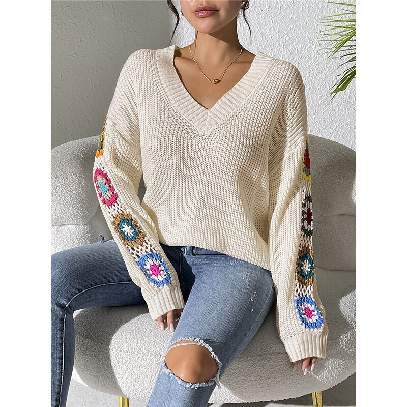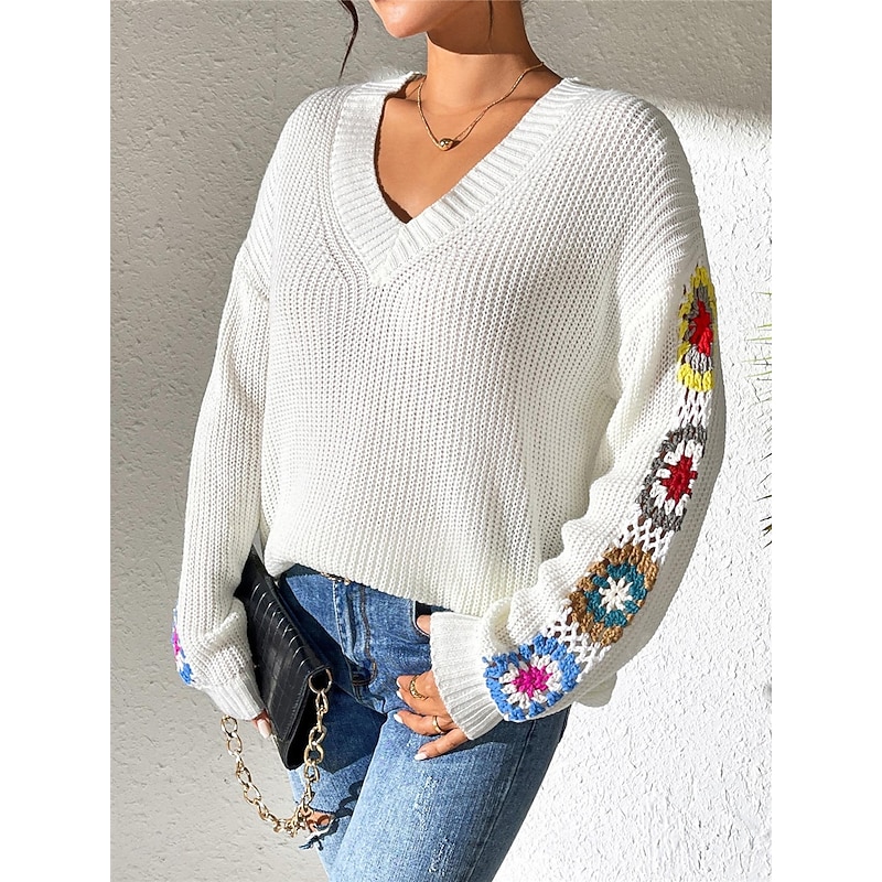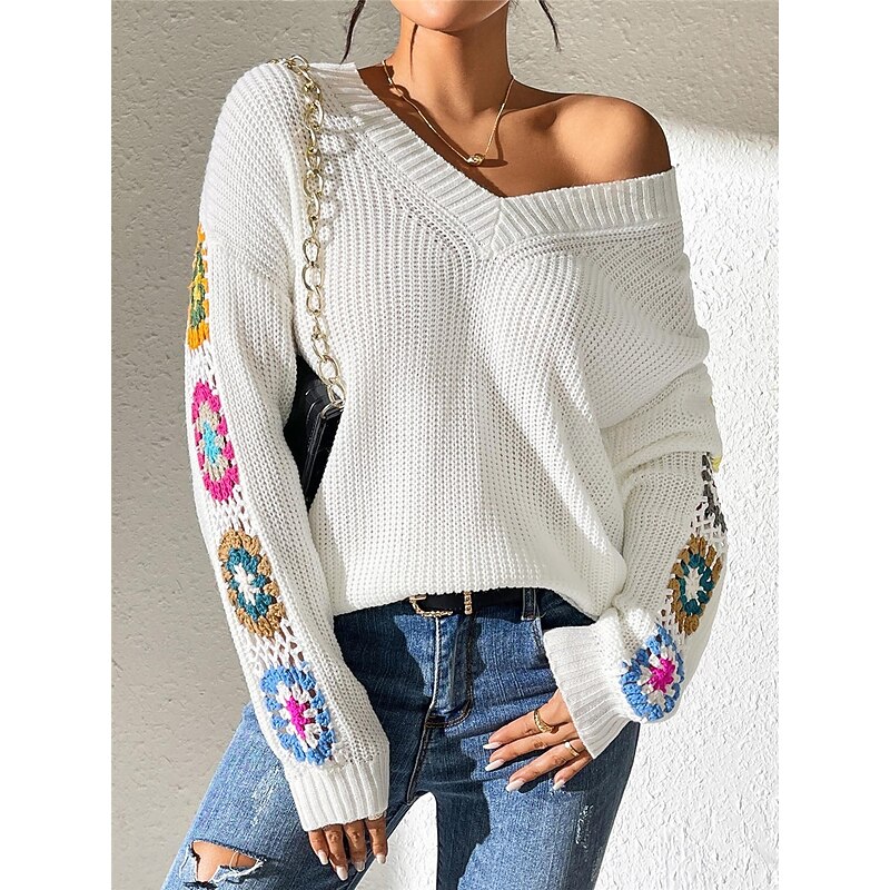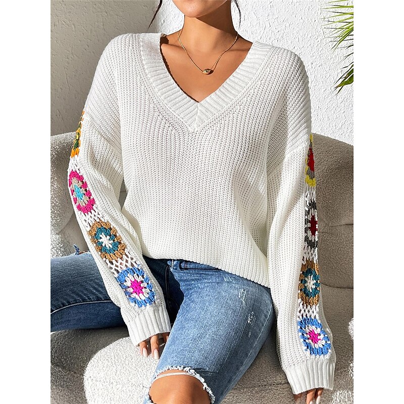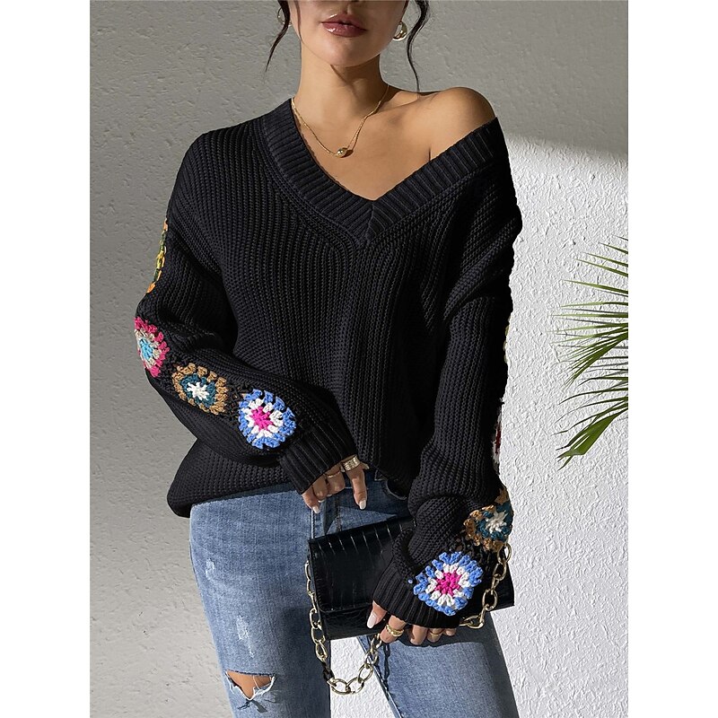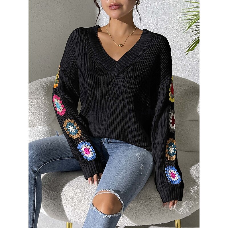 HOT ! Women's Sweater Casual Soft Floral Crochet V Neck Knitted Long Sleeve Regular Tops Knit Outdoor Daily Weekend Black White Fall Winter