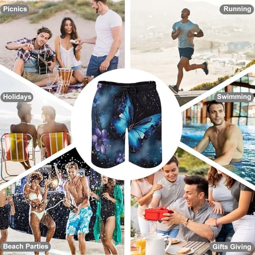 • Quick-Dry Fabric: Made from a Blend of 90% Polyester and 10% Spandex, This Men Galaxy Blue Butterfly Swim Trunks Is Quick-Drying, Skin-Friendly and Breathable. They Are Perfect for Summer Activities. Whether You're Surfing or Swimming, These Summer Galaxy Blue Butterfly Beach Shorts Will Dry Quickly to Keep You Comfortable