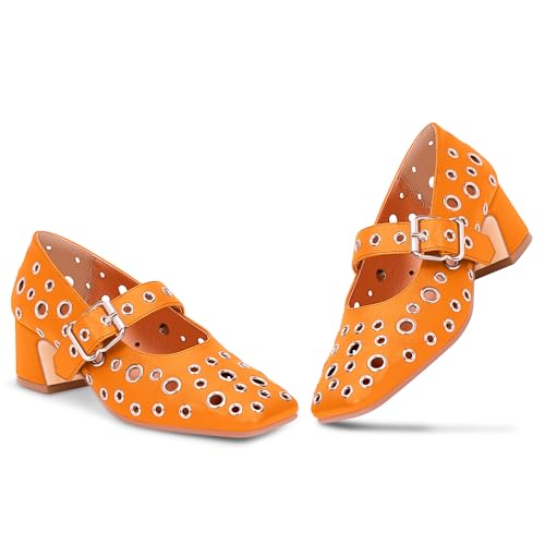 Women's Square Toe Mary Jane Pumps with Studded Metal Grommet Block Heel Buckle Strap Shoes 6