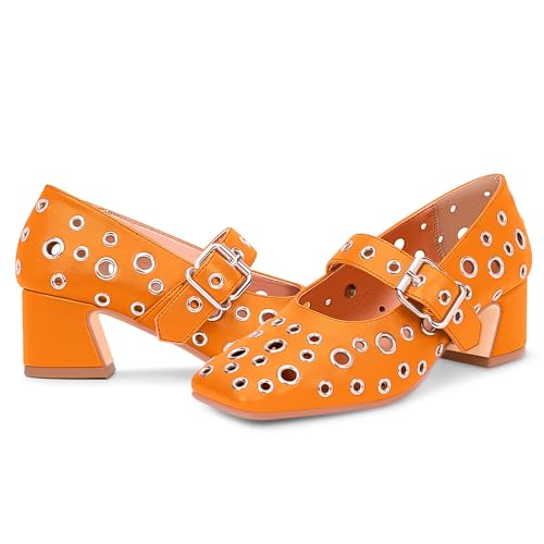 More information about Women's Square Toe Mary Jane Pumps with Studded Metal Grommet Block Heel Buckle Strap Shoes