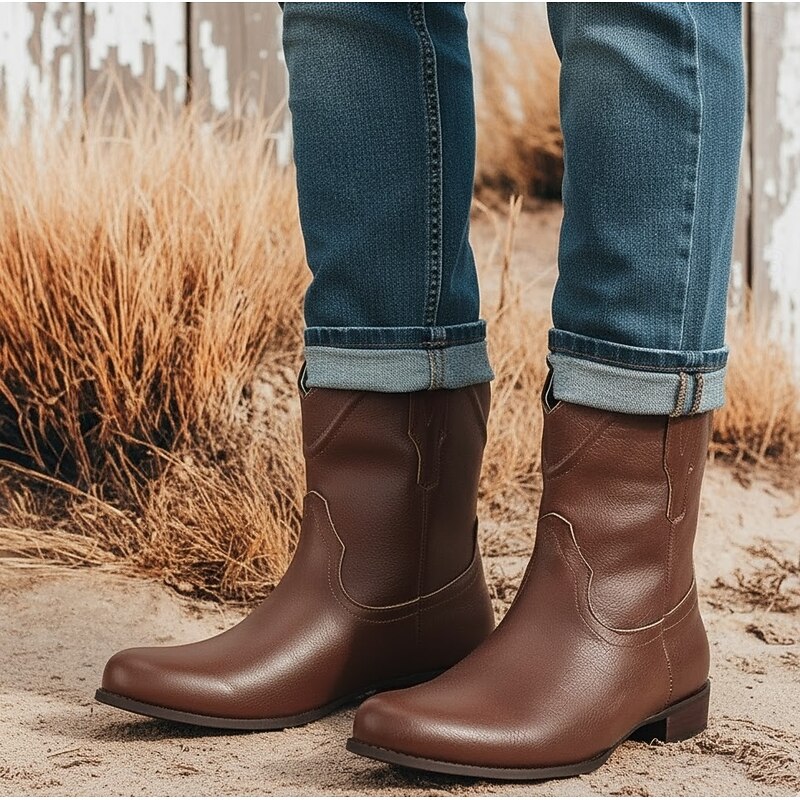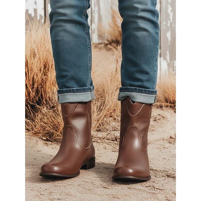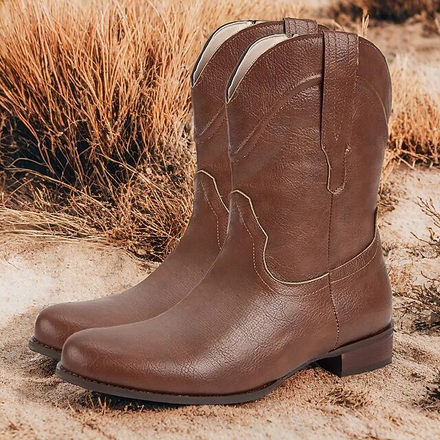 Highlights [Fabric and Material] : Expertly crafted from premium PU leather, these men's cowboy boots offer not only a refined appearance but also excellent durability. The brown hue adds a classic touch, perfect for both casual and formal settings. [Fit and Style] : These boots feature a mid-calf design that offers supportive coverage, while the rounded toe ensures comfortable wear throughout the day. They are designed with a low block heel, enhancing stability for prolonged use. Their versatile fit makes them ideal for pairing with a variety of outfits. [Design Highlights] : Showcasing Western inspiration, these boots are adorned with subtle stitching patterns characteristic of cowboy boots, combined with modern elements that add a contemporary twist. The solid-colored design and British-style influence make them stand out, yet maintain timeless appeal. [Occasions] : Ideal for daily wear and adaptable to various occasions, these boots are perfect for both casual and semi-formal events. Whether you are going for a walk or attending a gathering, these boots seamlessly blend style and function, making them a reliable choice for different settings. [Size Range] : Available in a comprehensive range of sizes from US6 (EU38) to US12 (EU45), these boots accommodate a wide spectrum of foot sizes, ensuring a suitable fit for many customers.