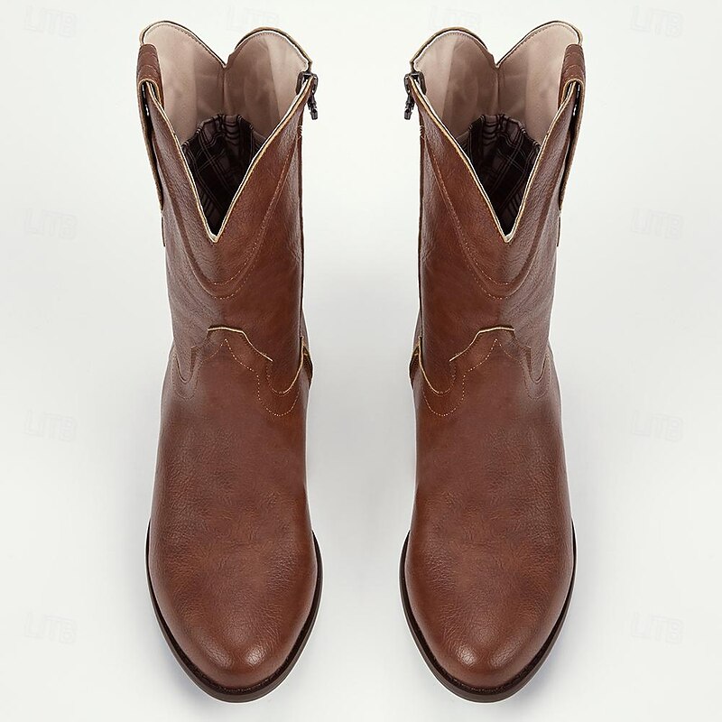 Men's PU Leather Western Cowboy Boots - Classic Brown Mid-Calf Boots for Casual and Formal Wear 1