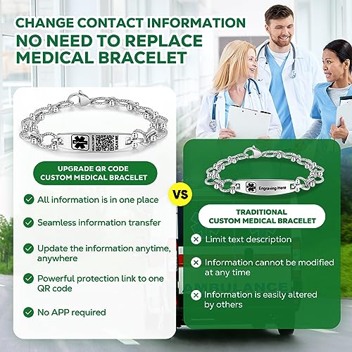 • 【ALL INFORMATION SET IN ONE PLACE】Get peace of mind with our medical alert bracelet that stores all your important medical information in one place. Unlike traditional engraved tags, our QR code technology can hold a vast amount of information, so you don't have to limit what you include. Perfect for those with epilepsy, cancer, diabetes, heart conditions, food allergies, and those in need of transplants.