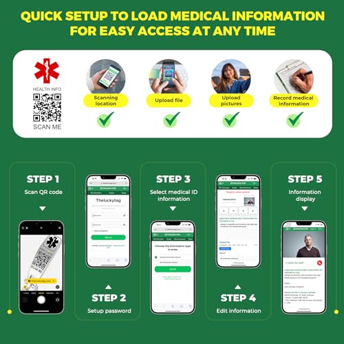 • 【EASY SETUP】Setting up your personalized medical bracelet is a breeze. Simply scan the QR code, set a password, and start editing your personal information. Enter your phone number and email, click "Activate," and start opening health records for your family. No app required!