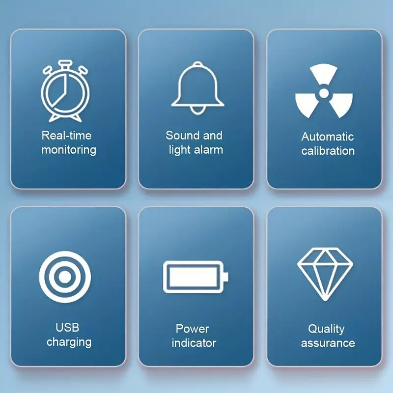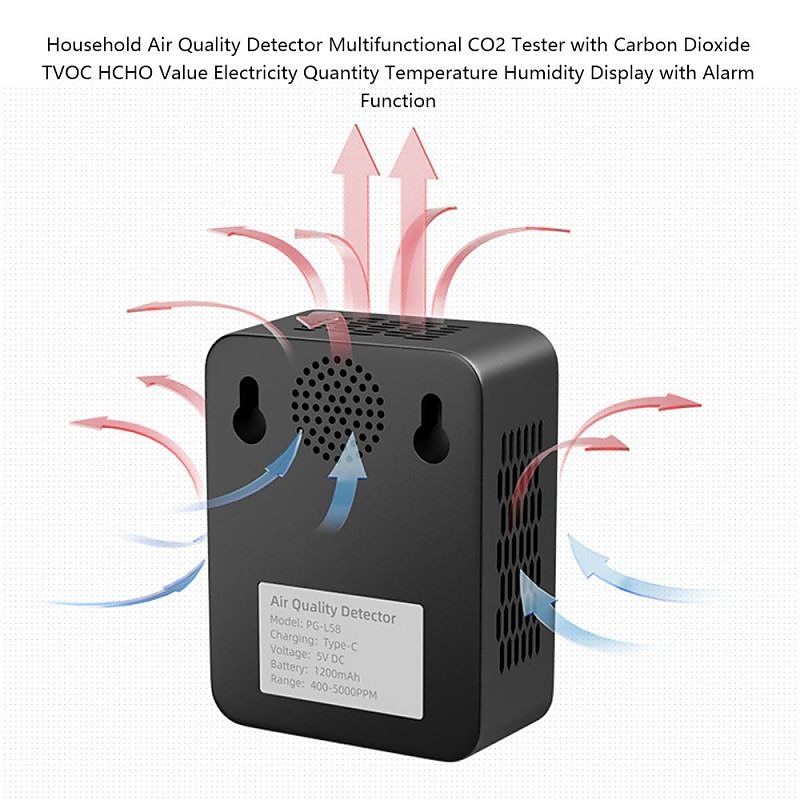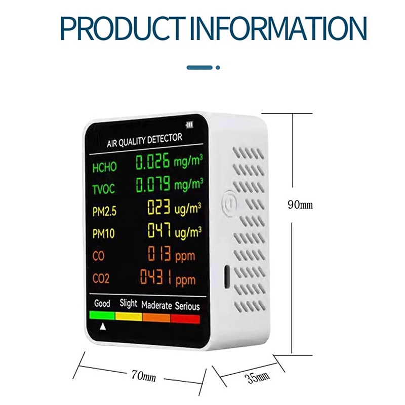 Highlights Product Selling point 1: 6 In 1 Air Quality Tester - Multifunctional air quality detector - Can test PM2.5, PM10, HCHO, TVOC, CO and CO2 simultaneously Product Selling point 2: Large Display Screen - Clear and easy-to-read detecting data - Convenient results retrieval Product Selling point 3: Portable Size - Small size that takes up minimal desk space - Easy to carry and transport Product Selling point 4: Wide Applications - Suitable for use in homes, offices, desktops, hotels, and other places Product Selling point 5: Built-in Multiple Sensors - Utilizes infrared, laser, and electrochemical detection technologies - Provides accurate and reliable data Product Selling point 6: Four Color Alarm - Different colors indicate different air quality levels - Green for good, yellow to orange to red for worse air quality Product Selling point 7: Temperature Units Conversion - Switch between Celsius and Fahrenheit - Sound alert when monitoring data exceeds the standard ideal for everyday use. top-grade materials and excellent craftsmanship ensure long-lasting durability.