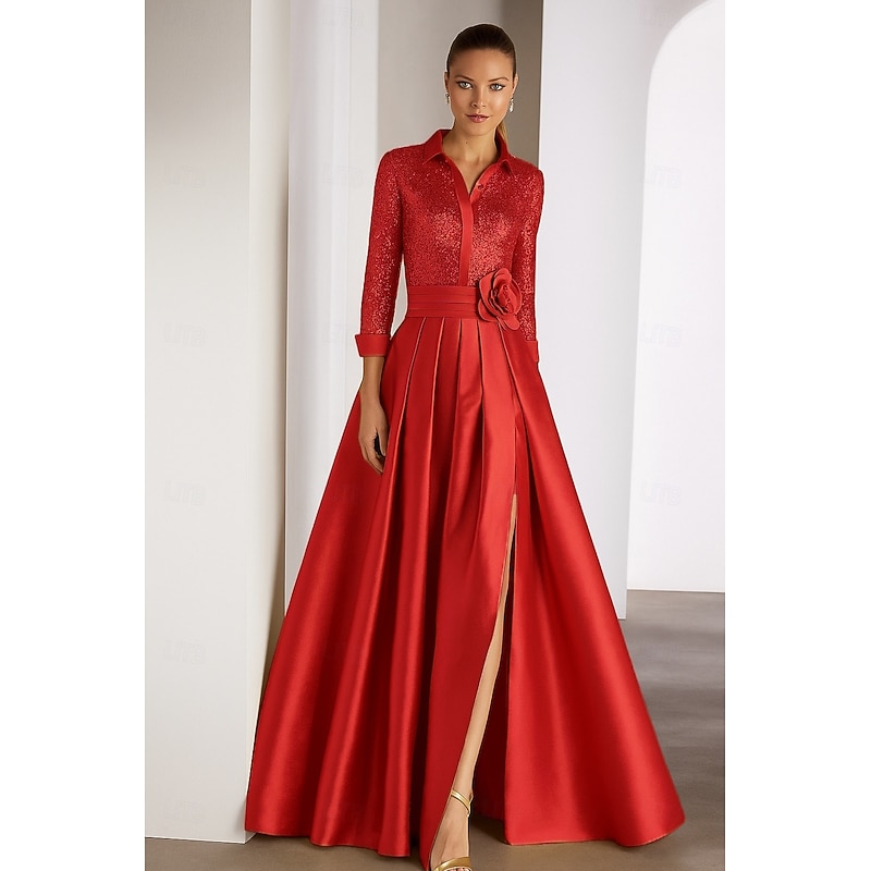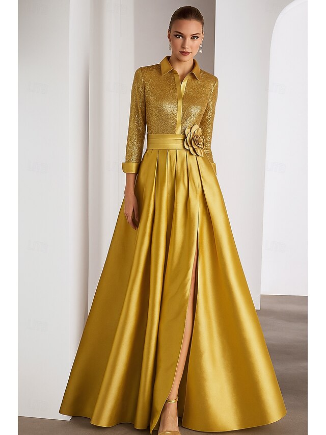 More information about Black Tie Mother of the Bride A-Line Evening Gown Elegant Dress Formal Wedding Floor Length Long Sleeve Shirt Collar Capes Satin with Glitter Pleats