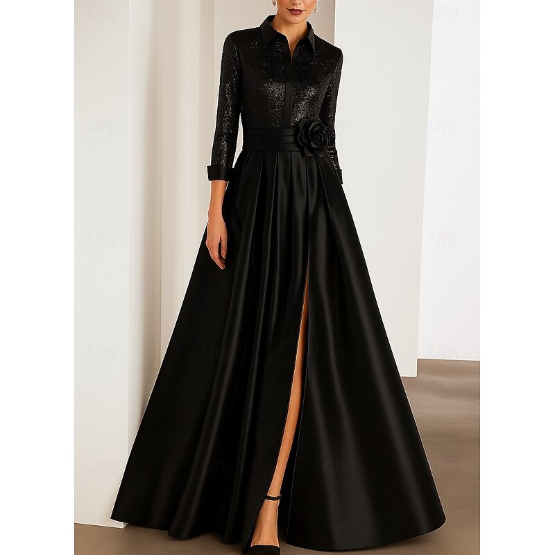 Black Tie Mother of the Bride A-Line Evening Gown Elegant Dress Formal Wedding Floor Length Long Sleeve Shirt Collar Capes Satin with Glitter Pleats 1
