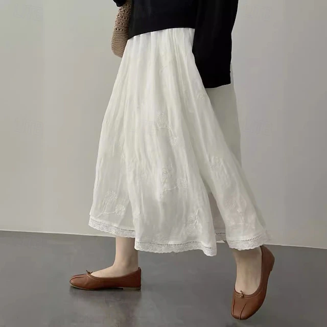 More information about Women's Skirt Fashion Maxi Mid Rise Skirts Plain Embroidered Micro-elastic Vacation Street White Summer Cotton