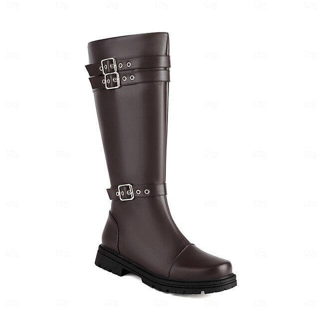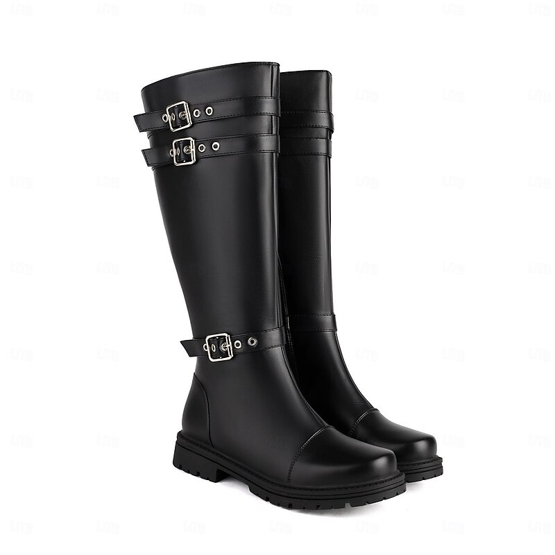 Highlights [Fabric] : Crafted from premium PU leather, these men’s boots offer a sleek and polished look that exudes both style and durability. The leather lining ensures comfort and warmth, making them a perfect choice for the colder months. [Silhouette] : These boots feature a knee-high design with a rounded toe and a slightly heeled silhouette, providing a balanced blend of comfort and elegance. The classic yet modern form makes them versatile for various outfits. [Design Highlights] : Accented with metal embellishments, the double buckle straps around the calf and ankle add an edgy and contemporary flair to these boots. The loafer closure type integrates ease and functionality, while the sturdy rubber outsole offers excellent grip, suitable for diverse terrains. [Occasions] : Ideal for both casual and formal settings, these stylish boots are perfect for activities ranging from walking and city strolling to attending festive gatherings. Their versatile style allows them to complement a wide array of seasonal outfits, adding a touch of chic sophistication. [Size Notice] : Available in a range of sizes from US6.5-7 to US12, these boots are designed to fit true to size, so it's recommended to select your usual size for the best fit.