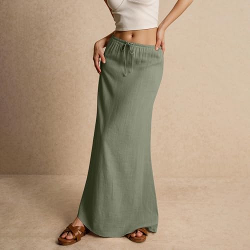 HOT ! Linen Skirts for Women 2025 Summer Casual Maxi Skirt Drawstring Low Rise A-Line Flowy Boho Beach Vacation Outfits