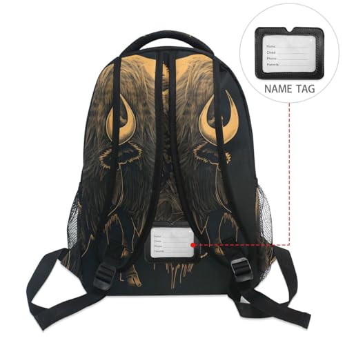Kids Travel Backpack Golden Line Bison Print Large Capacity School Bag with Name Tag S 5