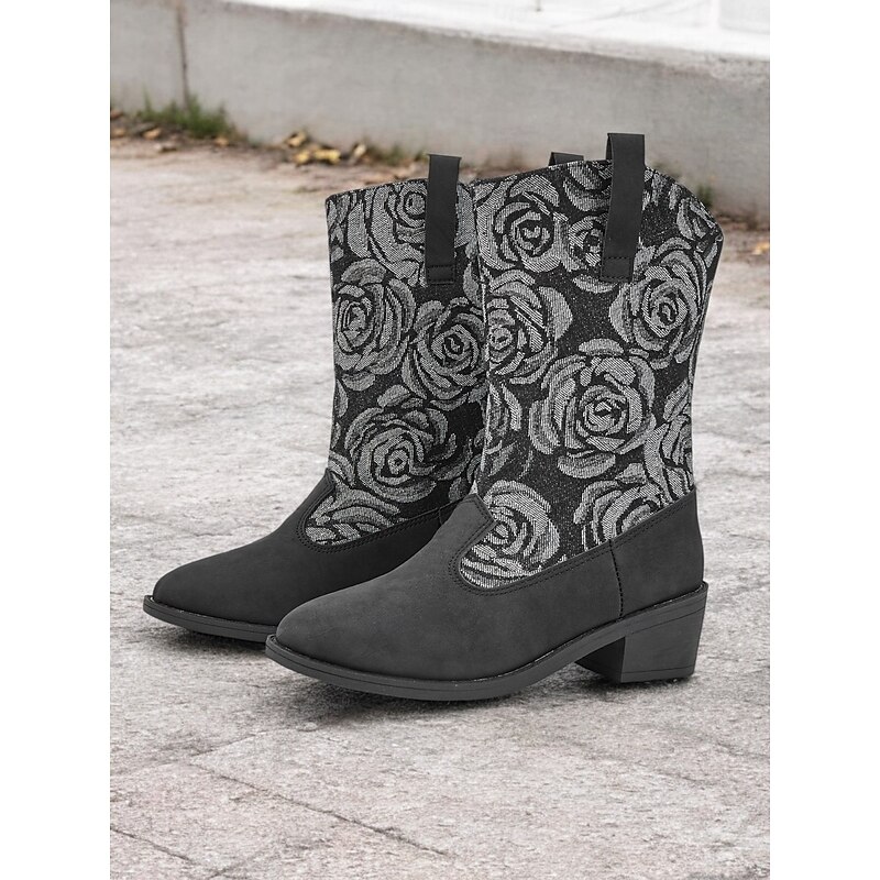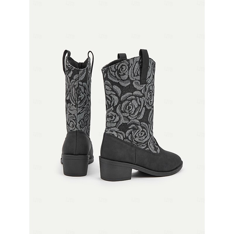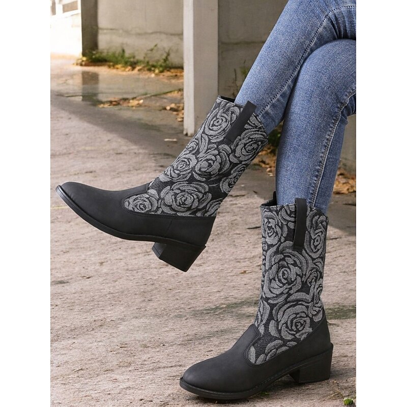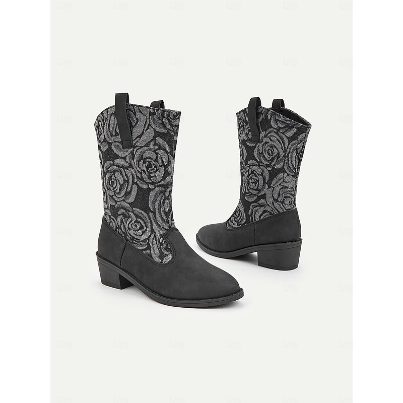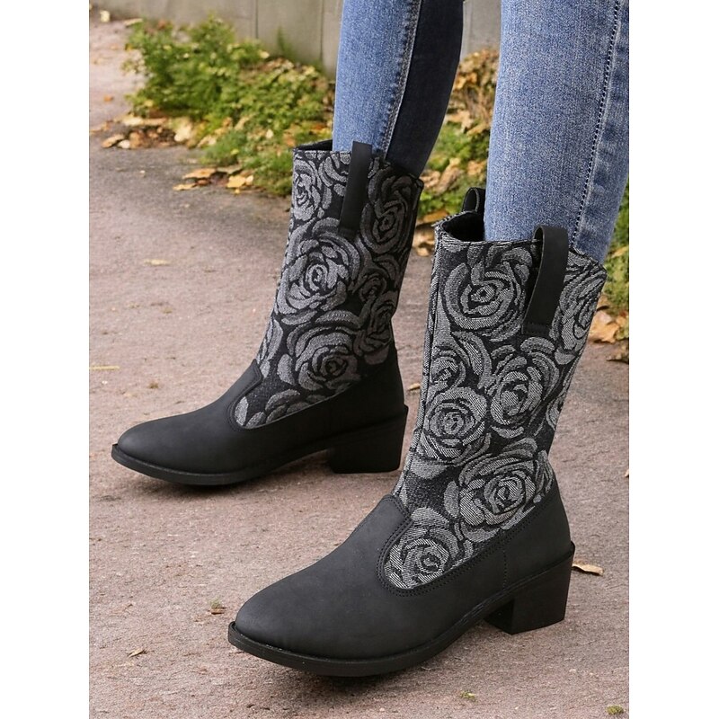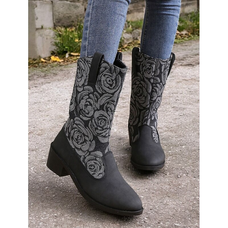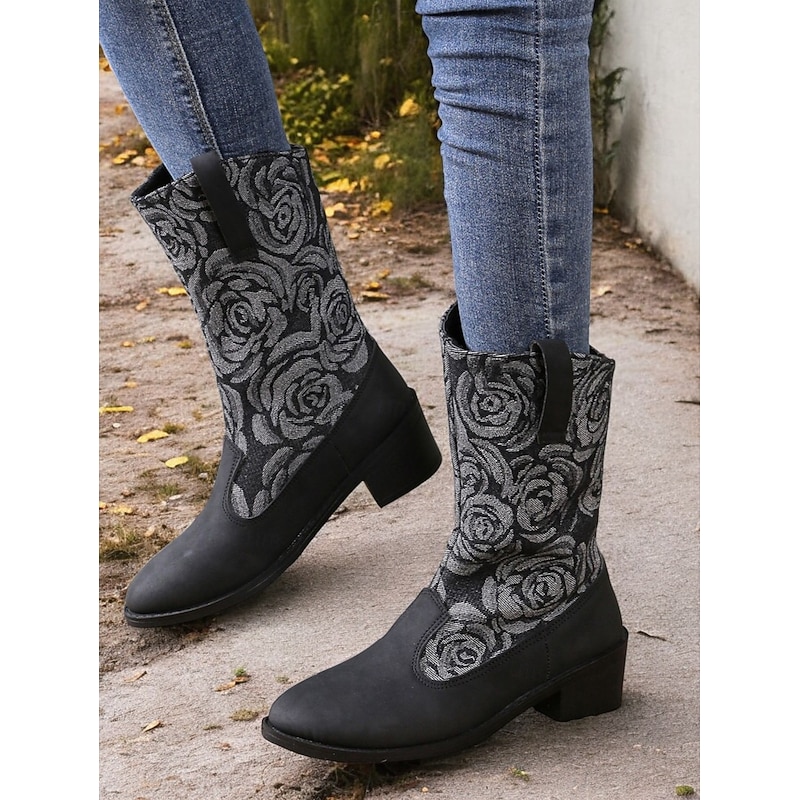 Highlights [Fabric] : Crafted from a unique blend of smooth blue faux leather and durable denim, these women's boots offer a luxurious feel and striking appearance. The textile lining ensures comfort and breathability, making them perfect for extended wear. [Shape/Style] : Featuring a chic mid-calf silhouette, these boots are designed for comfort and style. The low block heel provides stability and ease, making them ideal for daily wear. The round toe shape adds a classic touch while enhancing overall comfort. [Design Highlights] : The standout design element is the intricate floral embroidery on the textile panels, crafted in shades of grey, which adds a touch of sophistication and charm. The pull-on design with side tabs ensures easy wearing and removal, while the chunky heel offers a modern twist. [Occasions] : These boots are perfect for various occasions, from casual outings to semi-formal events. Whether you're heading to work or enjoying a weekend outdoor adventure, they add a fashionable edge to any ensemble, easily transitioning between vintage, cute, and elegant styles. [Size Range] : Available in a range of sizes from US6 to US10.5, these boots are designed to fit true to size, ensuring you can select your usual size with confidence. Suitable for spring, fall, and winter, they are a stylish choice for adding a retro, cowboy-inspired twist to your wardrobe.