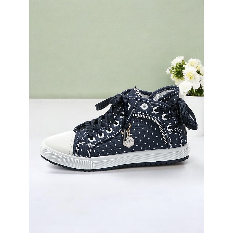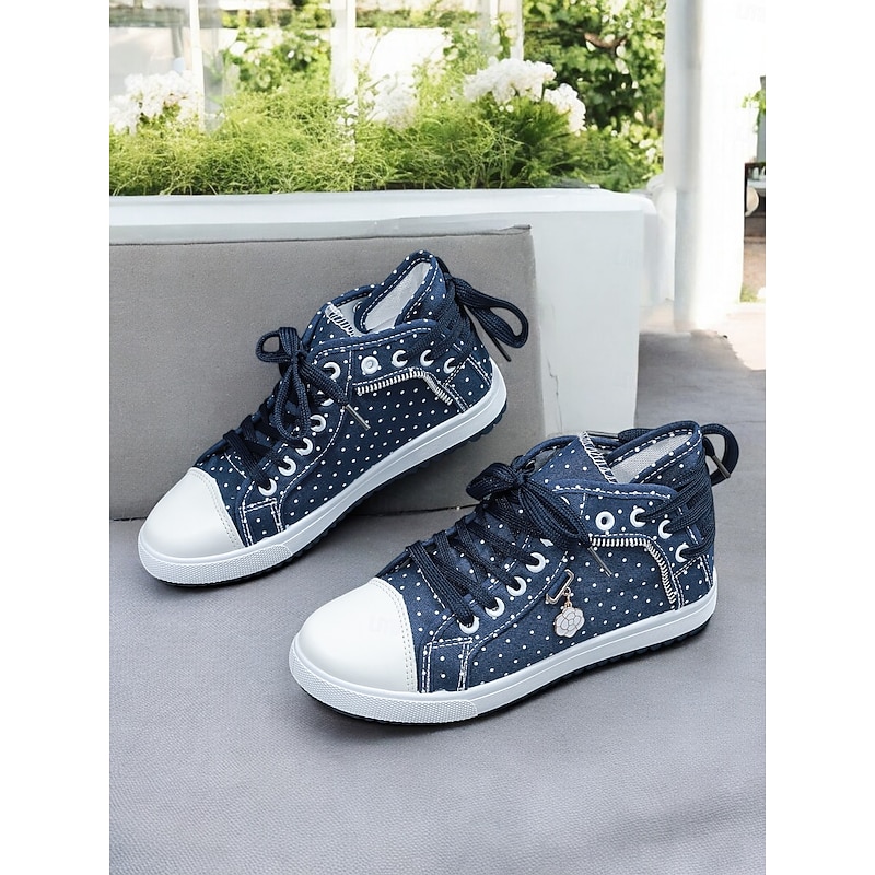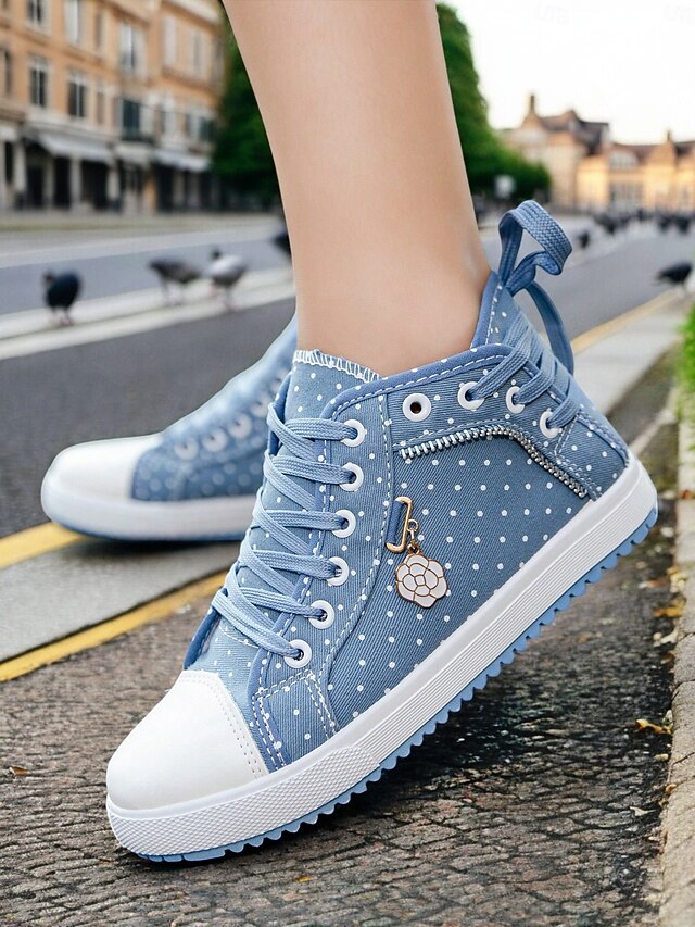 HOT ! Women's Polka Dot High-Top Canvas Sneakers – Casual Lace-Up Denim Shoes with Floral Charm, Stylish Streetwear for Daily Wear & Travel