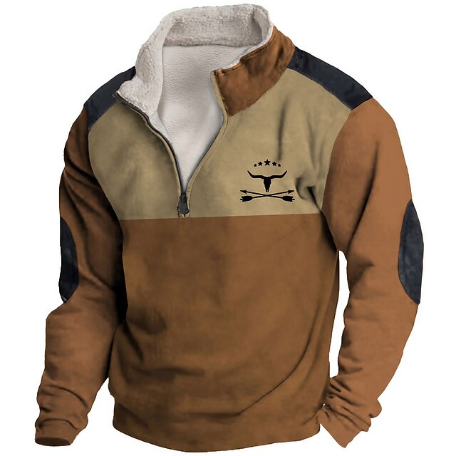 Highlights [Fabric:] Crafted from a high-quality polyester blend, this men's sweatshirt is designed to offer a soft and cozy feel. The fleece inner lining provides added warmth and insulation, making it perfect for the cooler fall and winter months. [Fit:] This sweatshirt features a regular fit that is perfect for layering over other garments. Its micro-elastic nature ensures comfortable movement and versatility, suitable for various body types. [Design Highlights:] The sweatshirt presents a stylish color block pattern utilizing earthy tones such as brown and beige, accentuated with darker shades on the shoulders and elbows for a rugged look. The quarter-zip neckline allows for easy wearing and adjustable comfort, while the embroidered steer head emblem completes its rustic, Western-inspired aesthetic. [Occasions:] Ideal for a variety of occasions such as vacations, holidays, casual outings, and streetwear. This versatile piece can be dressed up or down, making it suitable for both everyday wear and outdoor activities, where functionality and style are essential. [Size Range:] Available in a wide range of sizes from S to 5XL, ensuring a fitting option for a broad range of adults seeking both comfort and style in cooler seasons.