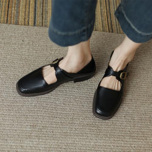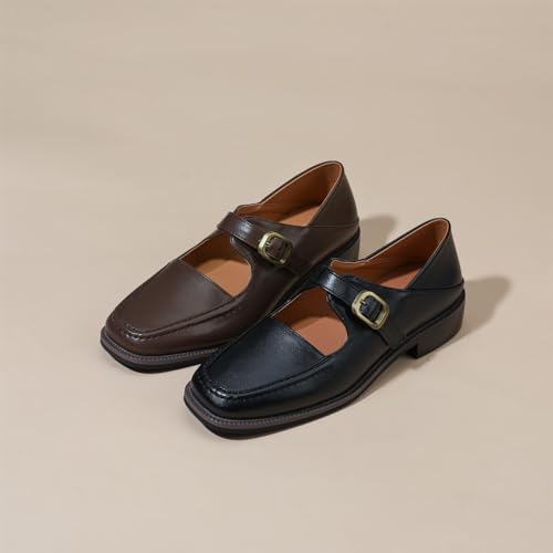 Women's Vintage Leather Mary Jane Flats,Square Toe Ankle Strap Buckle Low Stacked Heel Dress Flat Shoes 6