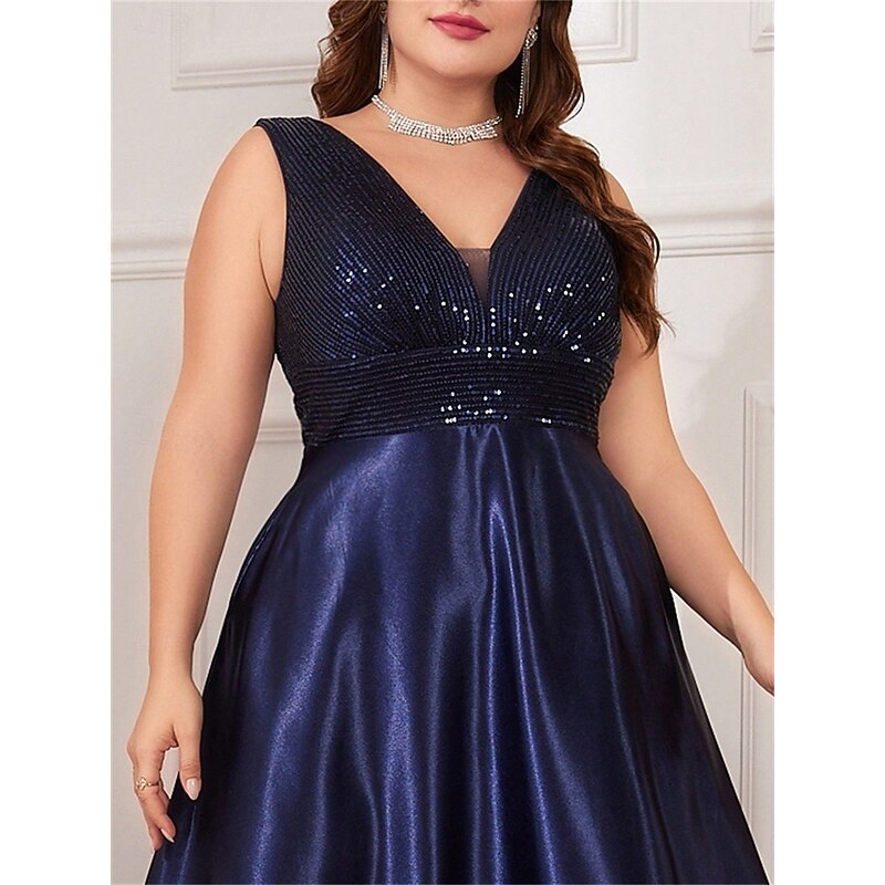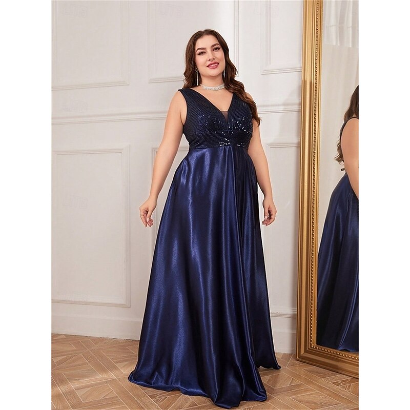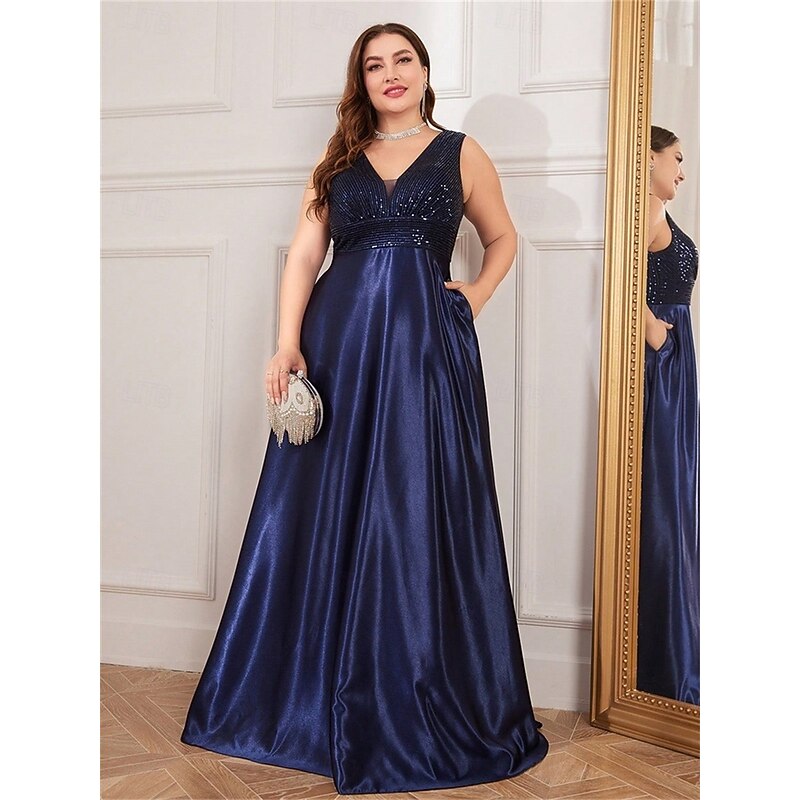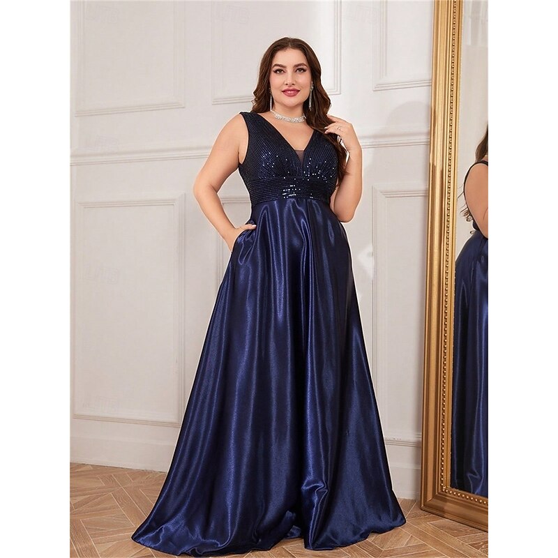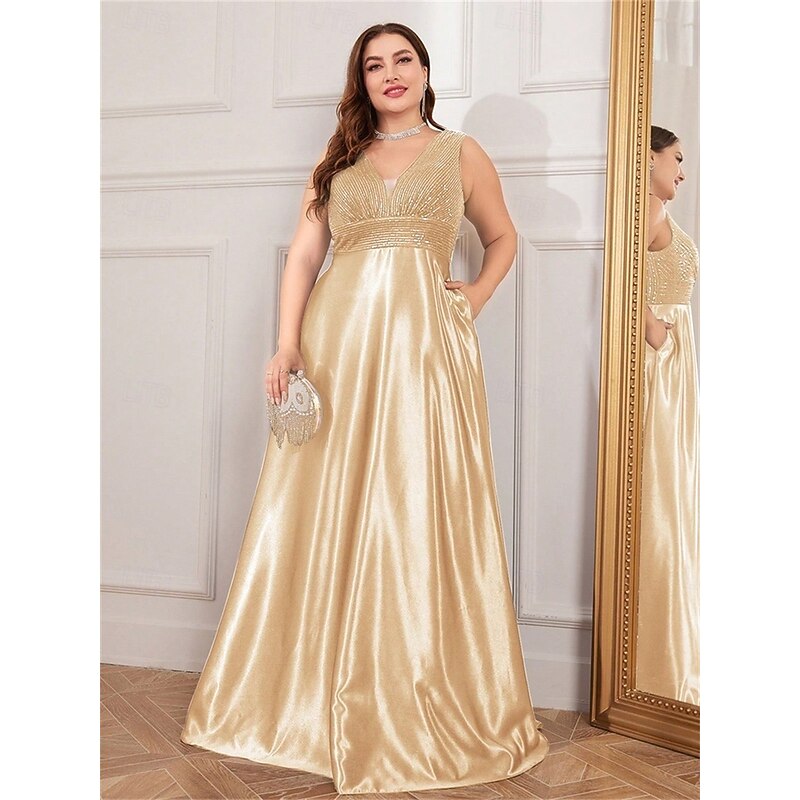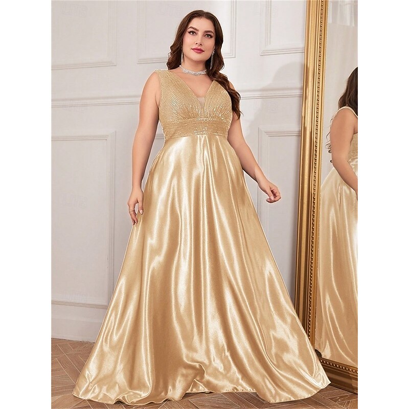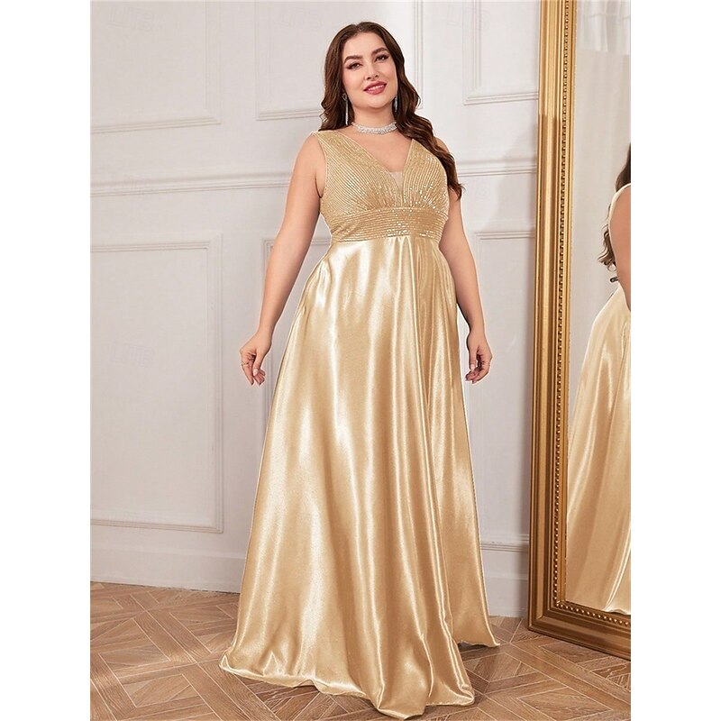 A-Line Plus Size Dresses Elegant Curve Dress Formal Wedding Floor Length Sleeveless V Neck Satin V Back with Pleats 1