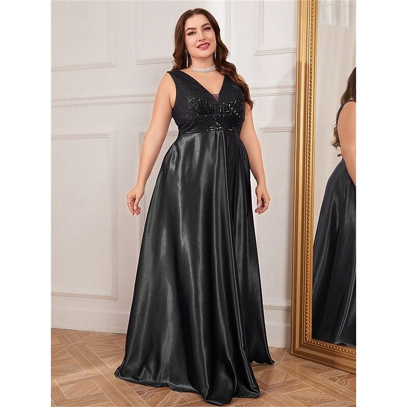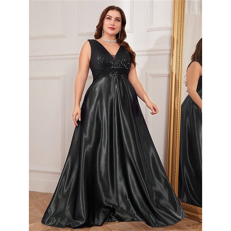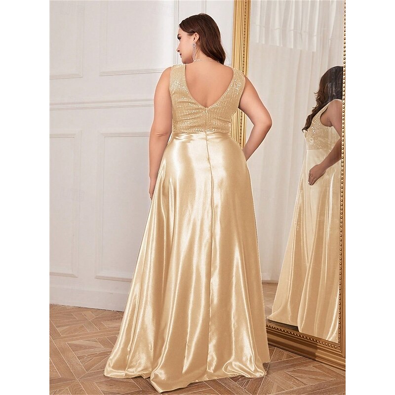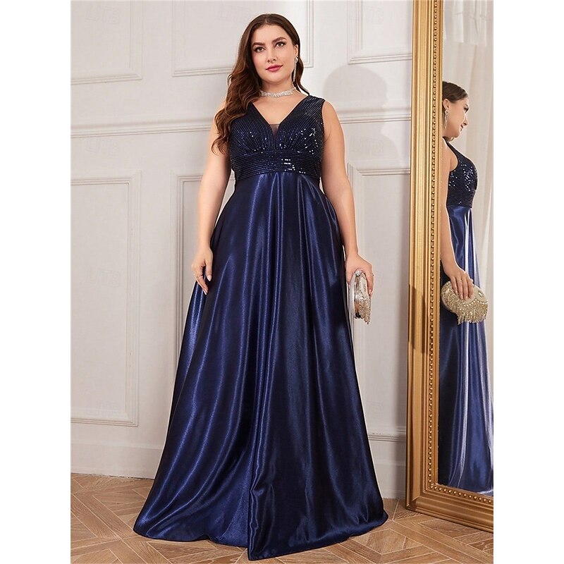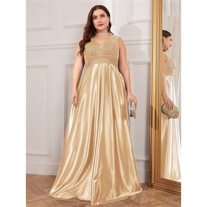 A-Line Plus Size Dresses Elegant Curve Dress Formal Wedding Floor Length Sleeveless V Neck Satin V Back with Pleats 18
