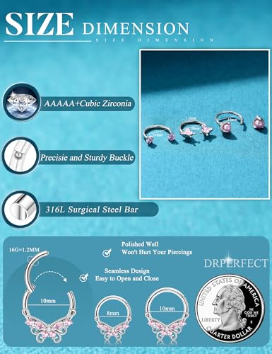 More information about Drperfect 8Pcs Nose Rings Hoops for Women, 316L Surgical Steel Septum Clicker Rings Hinged CZ Silver Nose Ring Hoop 16G Eyebrow Lip Cartilage Tragus Rook Helix Conch Daith Piercing Jewelry 8mm/10mm