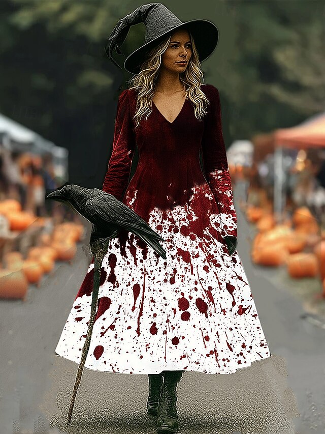 Halloween Women's Midi Dress A Line Dress Vacation Casual Boho Beach Regular Fit Graphic Abstract Long Sleeve V Neck White Dark Red Wine Brown Spring Fall Winter 6