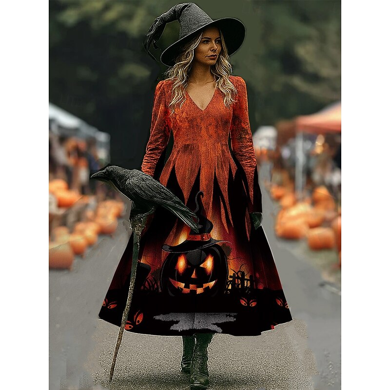 More information about Halloween Women's Midi Dress A Line Dress Vacation Casual Boho Beach Regular Fit Graphic Abstract Long Sleeve V Neck White Dark Red Wine Brown Spring Fall Winter