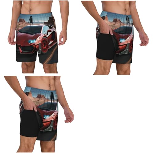 HOT ! Men's Swim Trunks Quick Dry Board Shorts Red Race Car Beach Shorts with Pocket Bathing Suits for Men