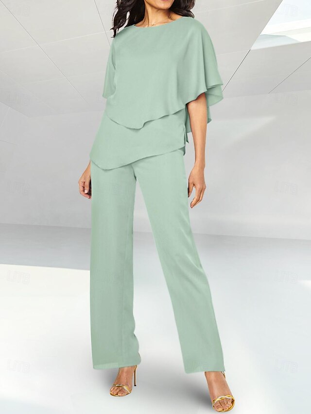 HOT ! Two Piece Mother of the Bride Beach Wedding Elegant Petite Jewel Neck Floor Length Chiffon Short Sleeve with Ruched
