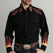 Men's Flame Shirt Western Shirt Cowboy Shirt Long Sleeve Vintage Retro Outdoor Casual WorkWear Spring Fall Turndown Front Two Pockets Linen Like Shirt Button Up Shirts Black 1 Black 1