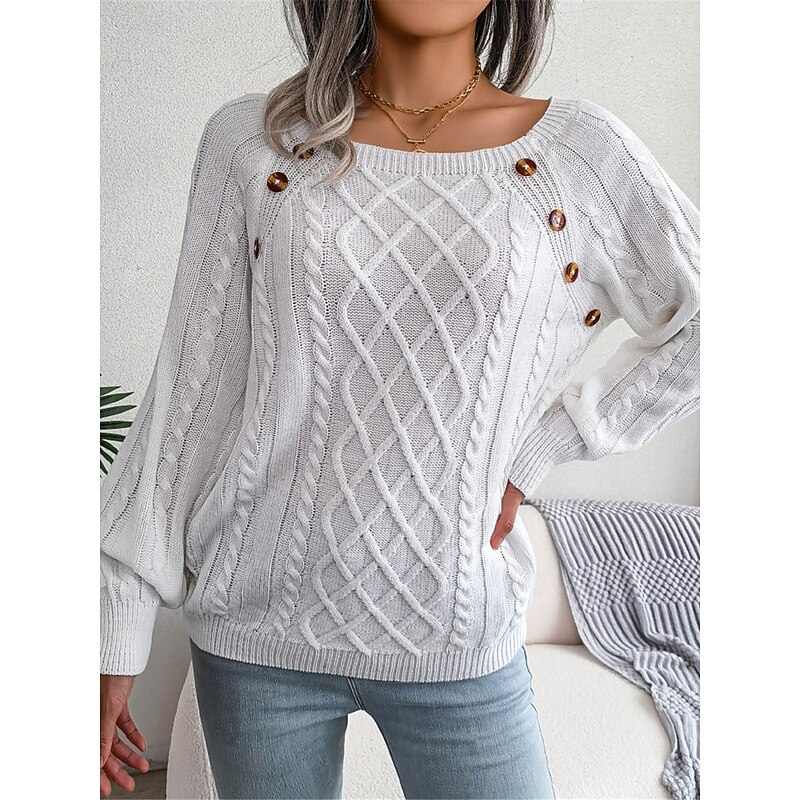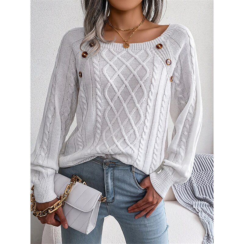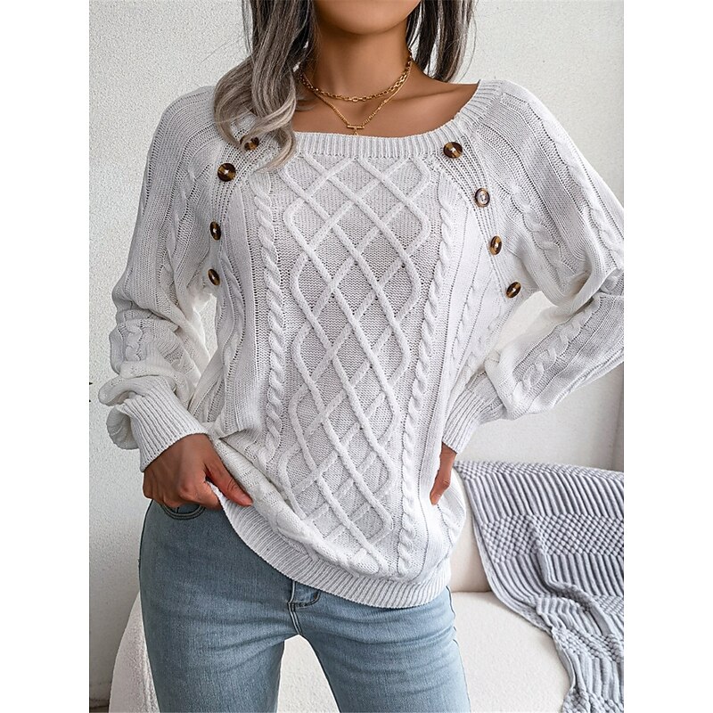 HOT ! Women's Sweater Pullover Sweater Jumper Casual Soft Pure Color Ribbed Square Neck Buttons Knitted Long Sleeve Regular Tops Knit Outdoor Daily Weekend White Khaki Fall Winter