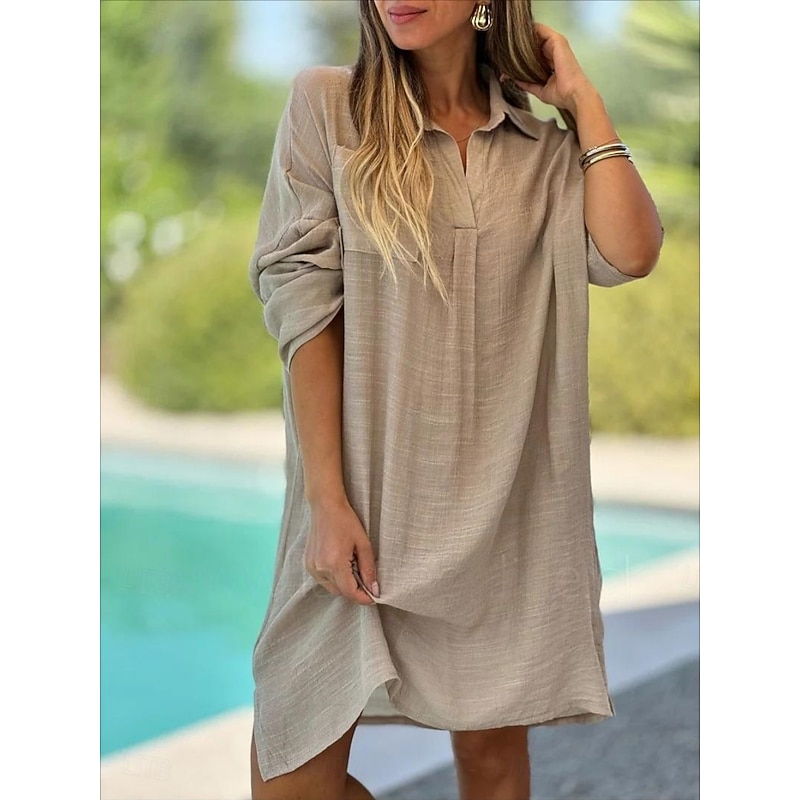 HOT ! Women's Mini Dress Cotton Linen Dresses Basic Vacation Daily Regular Fit Plain Long Sleeve V Neck White Pink Green Khaki Summer Spring