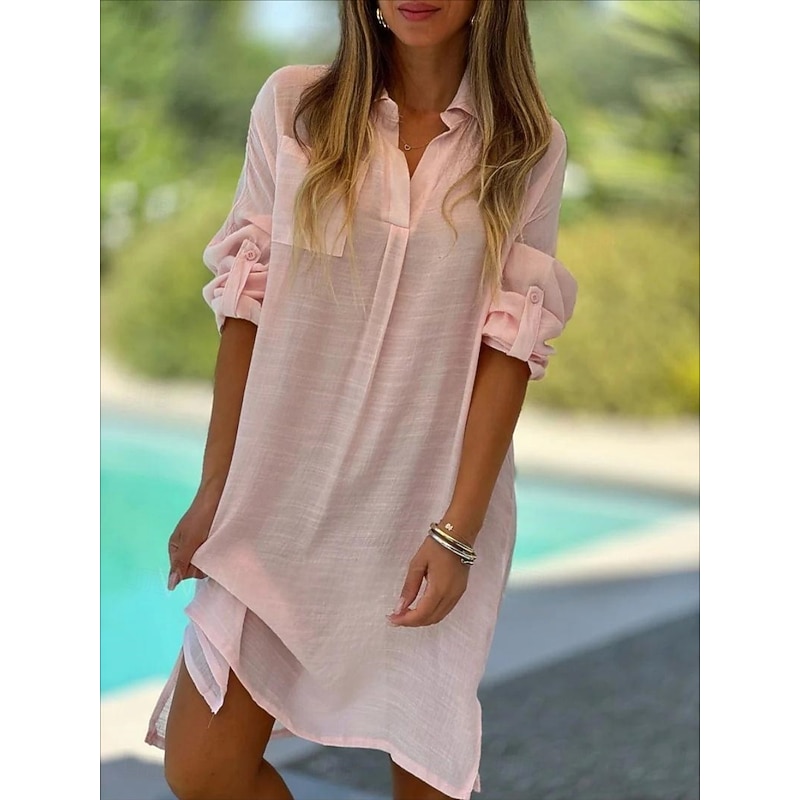Women's Mini Dress Cotton Linen Dresses Basic Vacation Daily Regular Fit Plain Long Sleeve V Neck White Pink Green Khaki Summer Spring 11