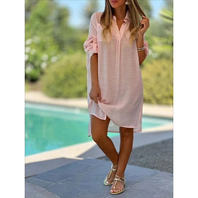Women's Mini Dress Cotton Linen Dresses Basic Vacation Daily Regular Fit Plain Long Sleeve V Neck White Pink Green Khaki Summer Spring 9
