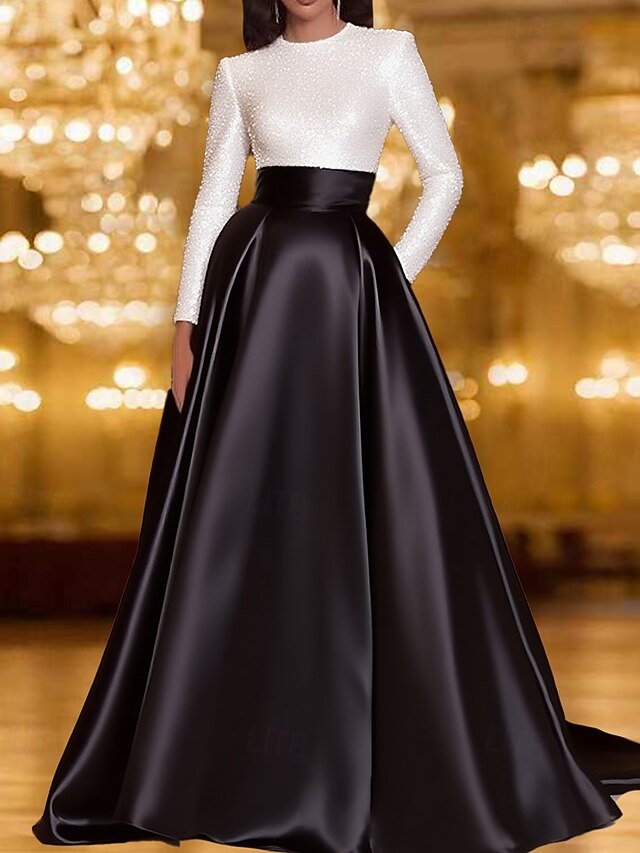 HOT ! Black and White A-Line Evening Dresses Elegant Gown Formal Wedding Floor Length Long Sleeve Crew Neck Pocket Satin with Sequin Pocket