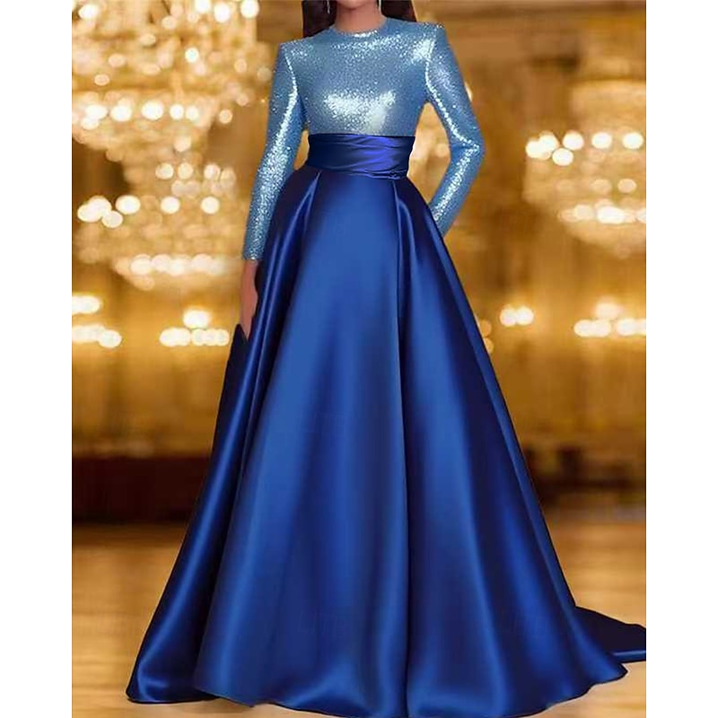 More information about Black and White A-Line Evening Dresses Elegant Gown Formal Wedding Floor Length Long Sleeve Crew Neck Pocket Satin with Sequin Pocket