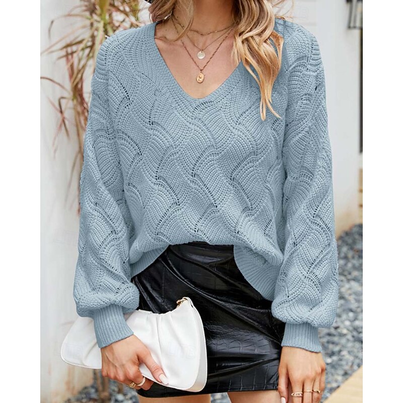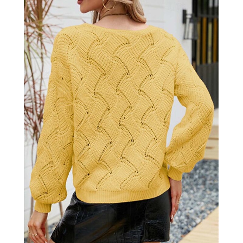 More information about Women's Sweater Elegant Fashion Daily Solid Color Crochet V Neck Knitted Long Sleeve Regular Tops Knit Work Yellow Dusty Blue Fall Winter