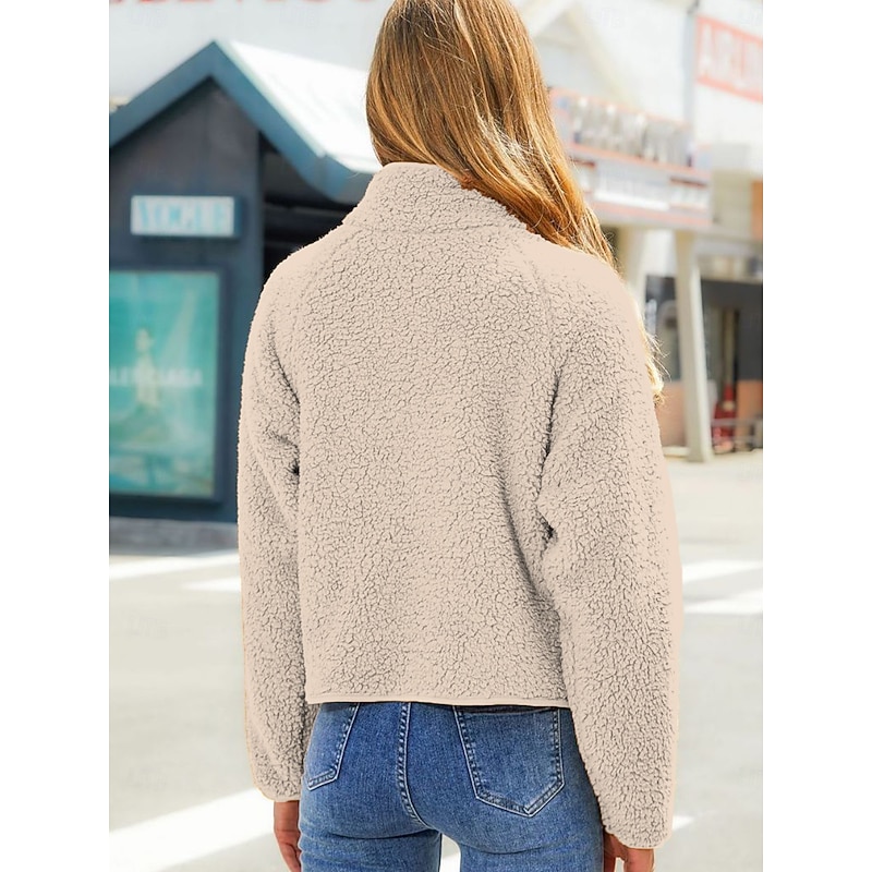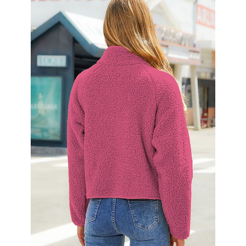 More information about Women's Fleece Jacket Warm Zipper Fashion Modern Casual Plain Work Daily Wear Zipper Short Stand Collar Loose Fit Long Sleeve Outerwear Black White Red Fall Winter